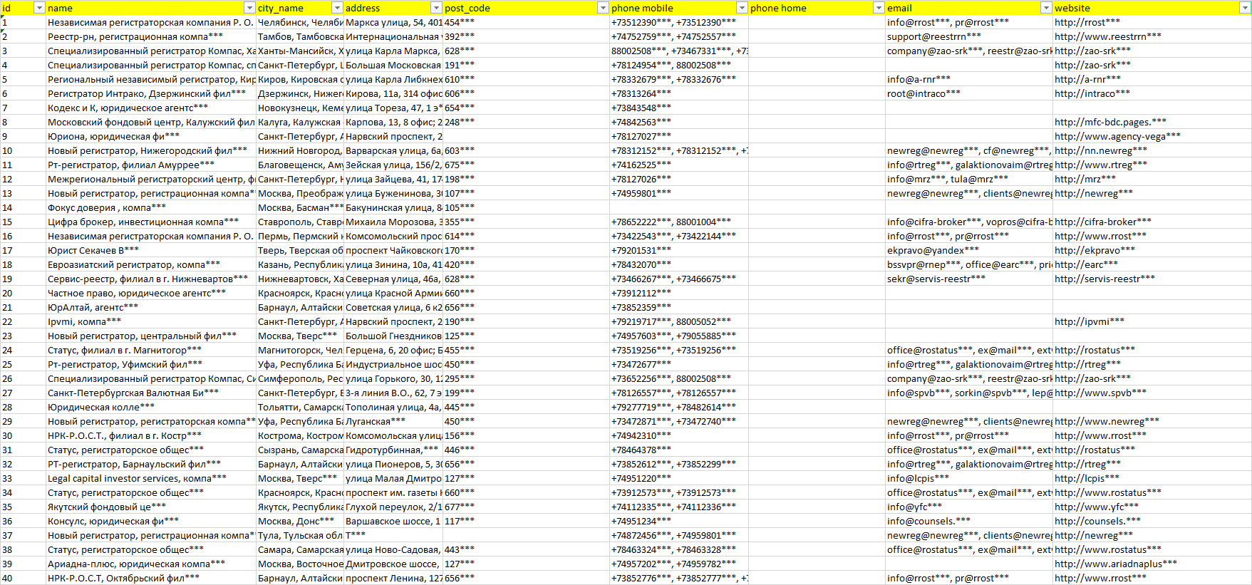 База компаний регистрация ценных бумаг, вся РФ в формате Excel с эл. почтами, телефонами, сайтами, ссылками на соц сети, координатами и другой информацией. Скачайте демо версию, чтобы ознакомиться с данными.