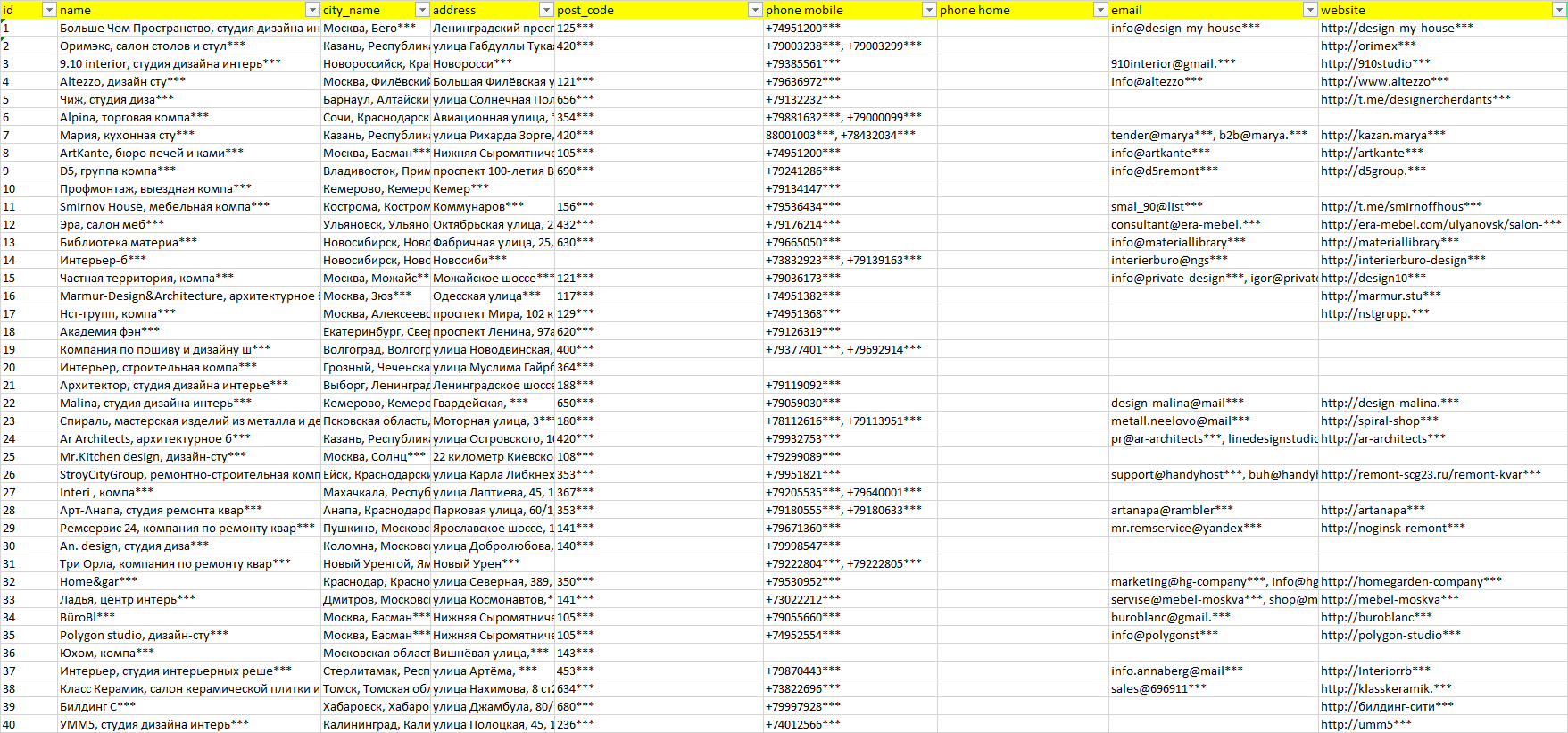 База организаций дизайн интерьеров, вся Россия в формате Excel с эл. почтами, телефонами, сайтами, ссылками на соц сети, координатами и другой информацией. Скачайте демо версию, чтобы ознакомиться с данными.