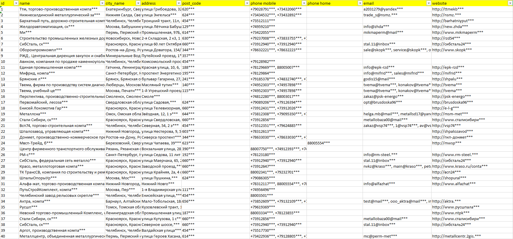 Мы автоматически собираем такие данные с различных открытых источников, обрабатываем, структурирует и упорядочиваем их, предоставляя пользователю возможность скачать результат в формате Excel. По принципу работы наш сервис аналогичен поисковым системам, таким как Google или Яндекс, но с возможностью экспорта найденной информации в удобном табличном виде.
