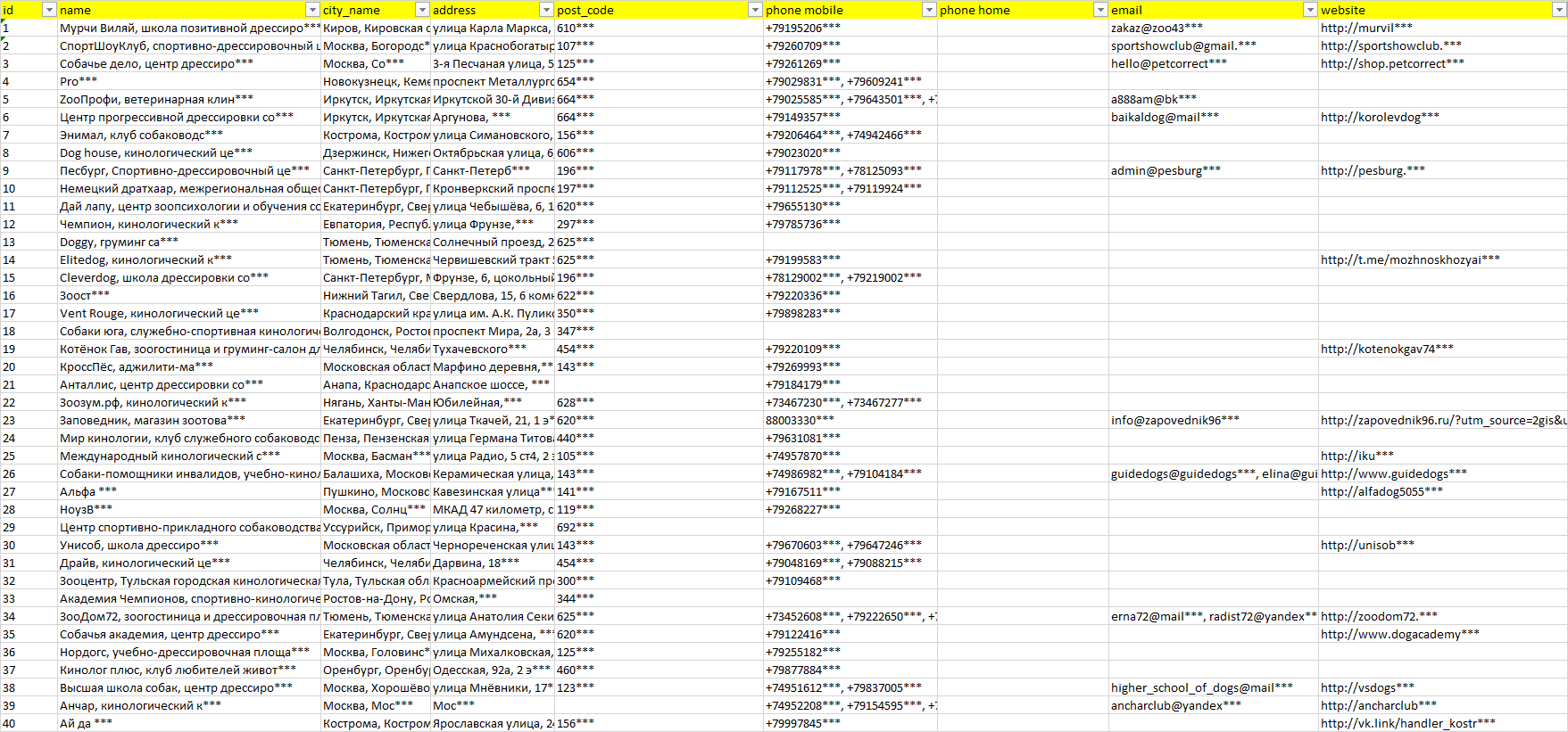 База компаний кинологи, вся РФ в формате Excel с эл. почтами, телефонами, сайтами, ссылками на соц сети, координатами и другой информацией. Скачайте демо версию, чтобы ознакомиться с данными.