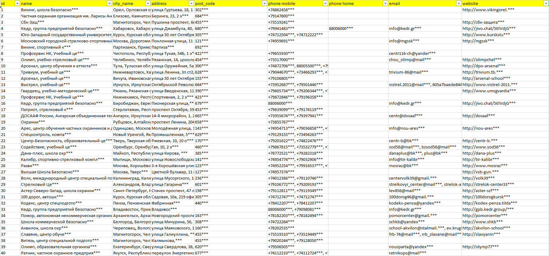 База компаний обучение охранников, вся РФ в формате Excel с эл. почтами, телефонами, сайтами, ссылками на соц сети, координатами и другой информацией. Скачайте демо версию, чтобы ознакомиться с данными.