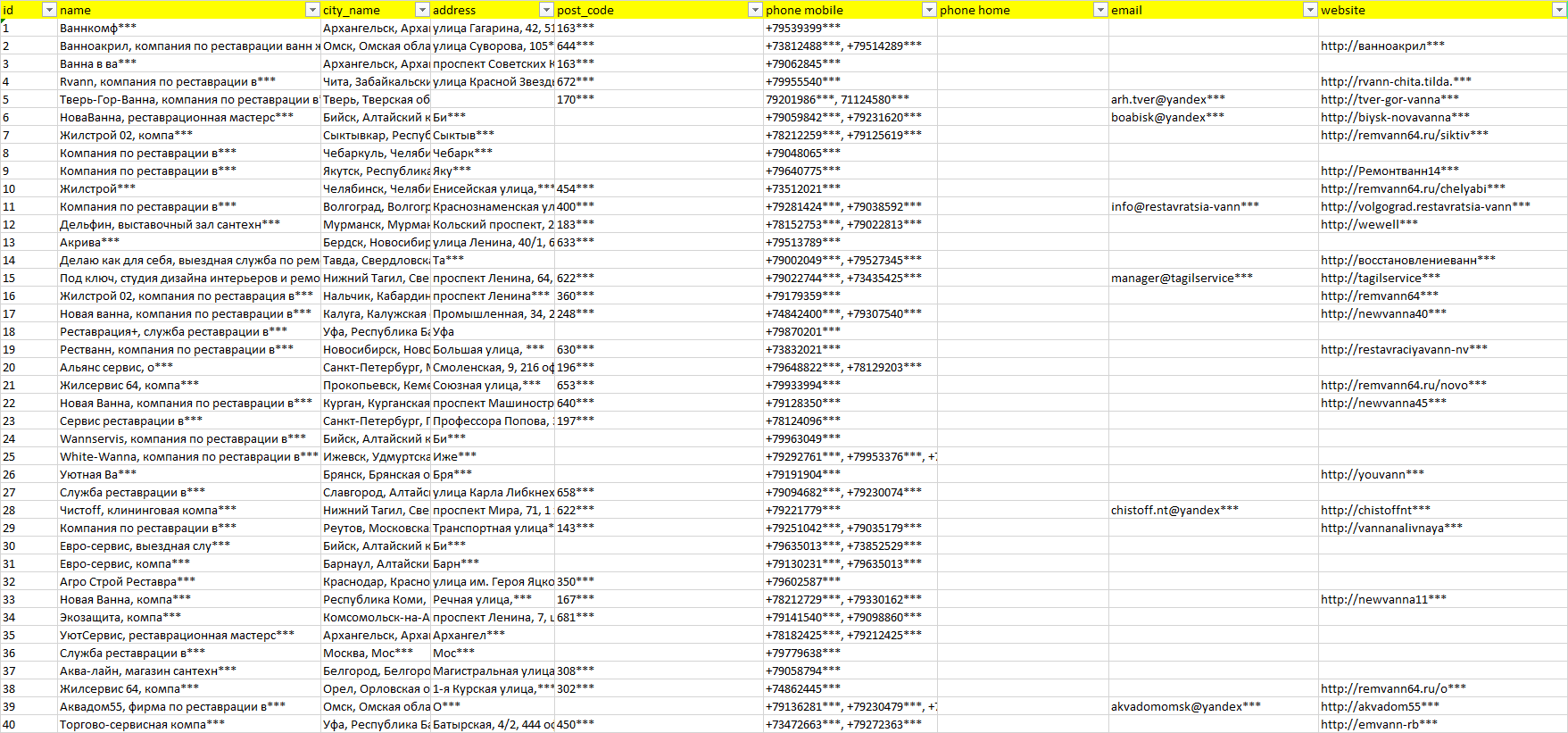 База компаний реставрация ванн, вся РФ в формате Excel с эл. почтами, телефонами, сайтами, ссылками на соц сети, координатами и другой информацией. Скачайте демо версию, чтобы ознакомиться с данными.