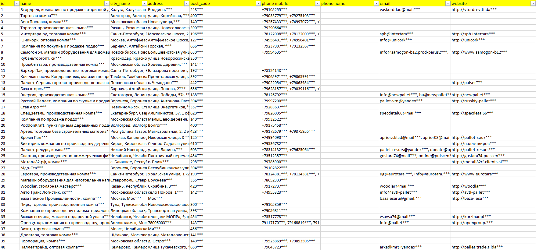 База компаний деревянная тара, вся РФ в формате Excel с эл. почтами, телефонами, сайтами, ссылками на соц сети, координатами и другой информацией. Скачайте демо версию, чтобы ознакомиться с данными.