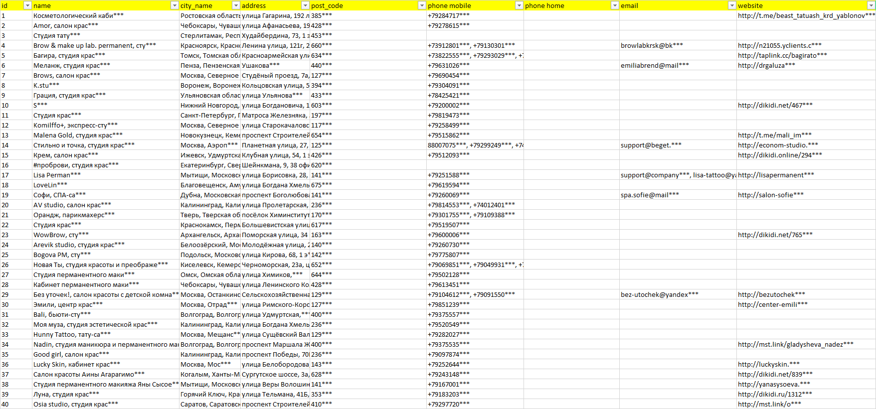 База компаний перманентный макияж, вся РФ в формате Excel с эл. почтами, телефонами, сайтами, ссылками на соц сети, координатами и другой информацией. Скачайте демо версию, чтобы ознакомиться с данными.