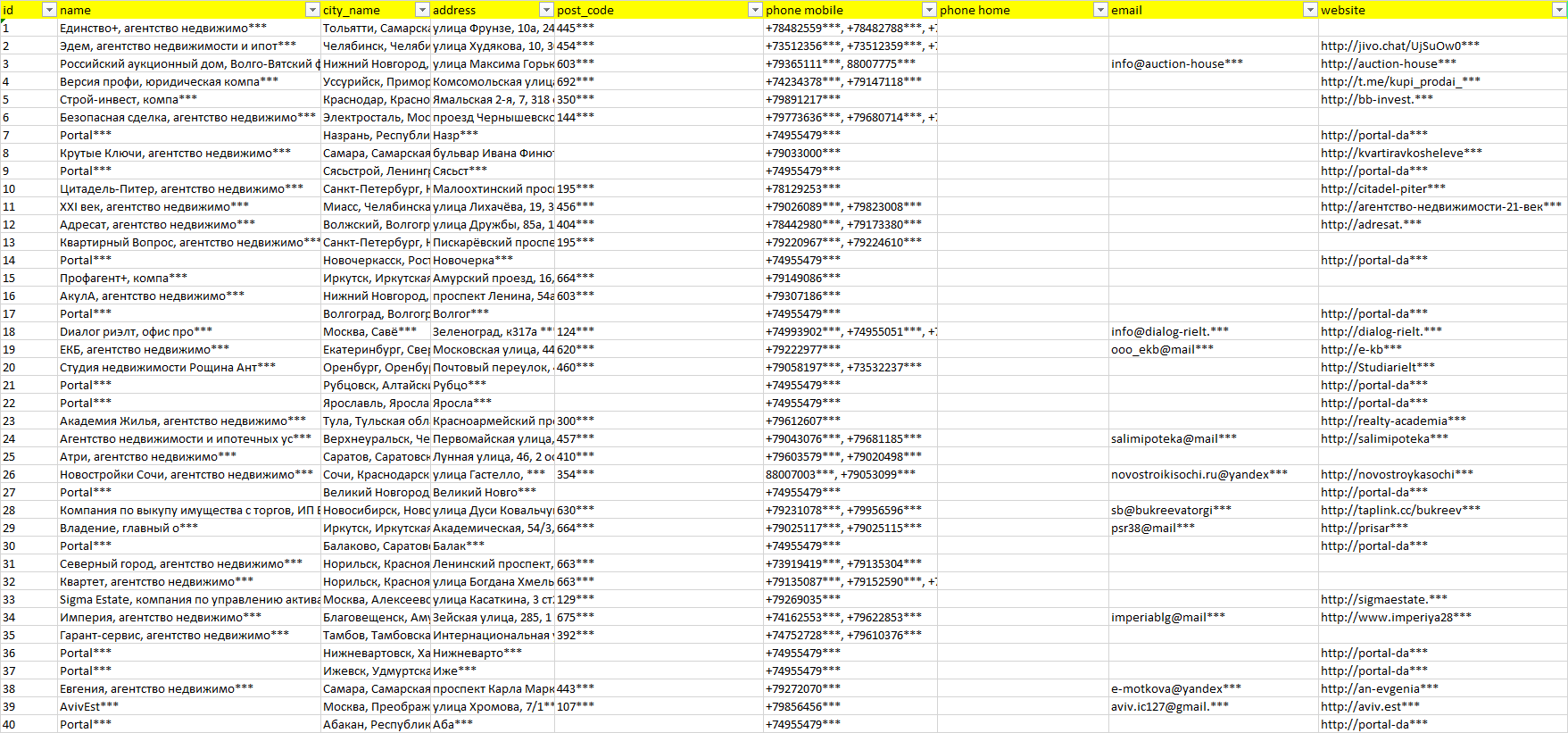 База организаций продажа залогового имущества, вся Россия в формате Excel с эл. почтами, телефонами, сайтами, ссылками на соц сети, координатами и другой информацией. Скачайте демо версию, чтобы ознакомиться с данными.