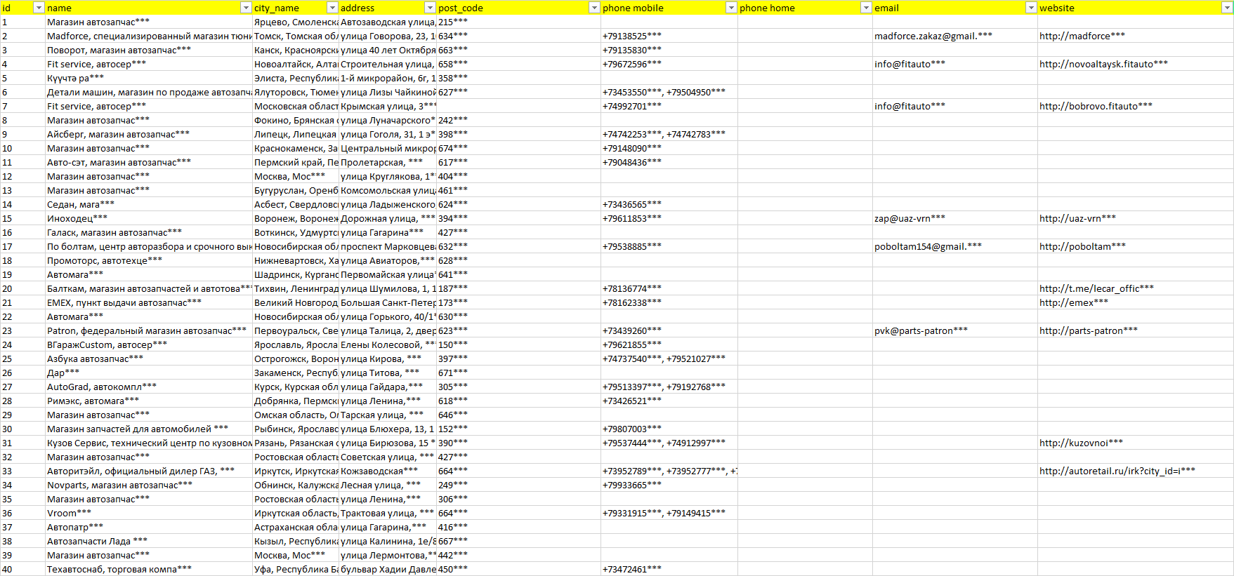 База организаций запчасти для отечественных авто, вся Россия в формате Excel с эл. почтами, телефонами, сайтами, ссылками на соц сети, координатами и другой информацией. Скачайте демо версию, чтобы ознакомиться с данными.