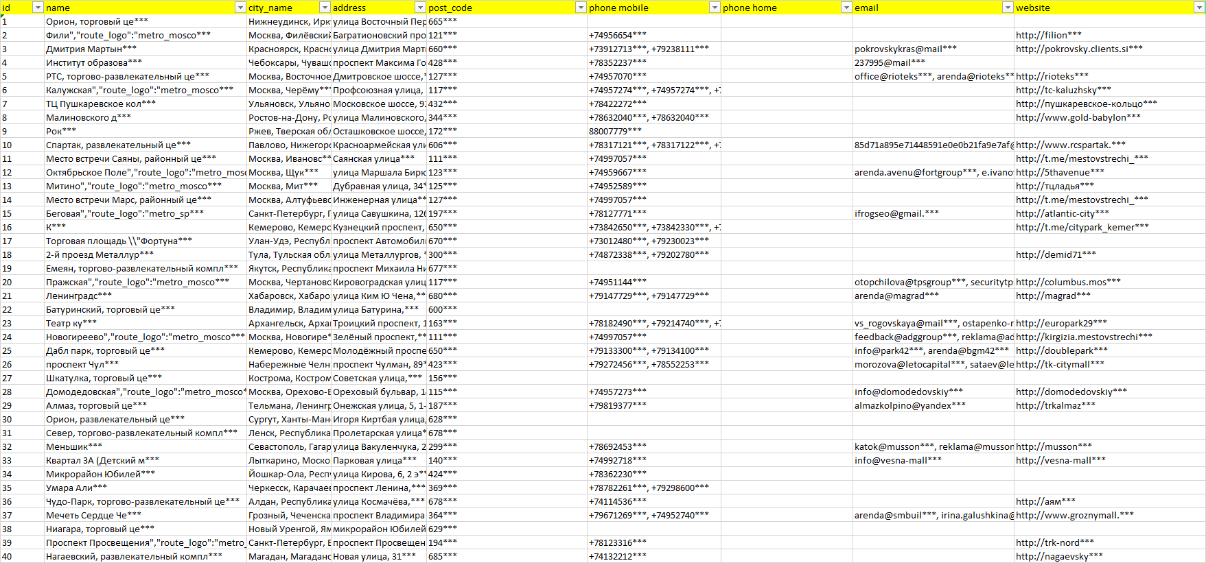 База компаний торгово-развлекательные центры, вся РФ в формате Excel с эл. почтами, телефонами, сайтами, ссылками на соц сети, координатами и другой информацией. Скачайте демо версию, чтобы ознакомиться с данными.