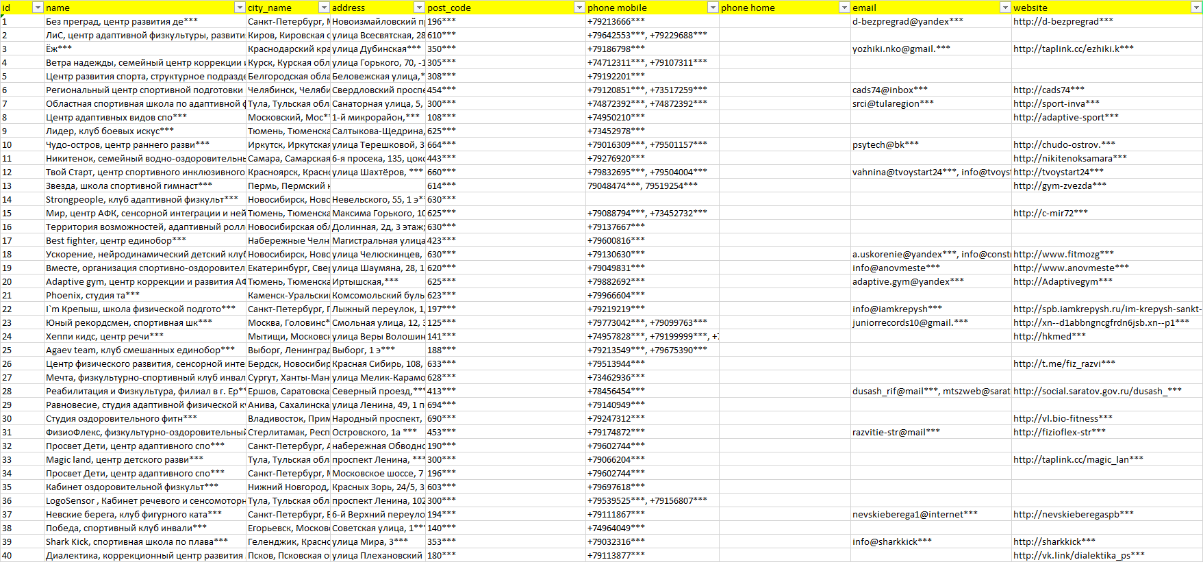 База компаний центры адаптивного спорта, вся РФ в формате Excel с эл. почтами, телефонами, сайтами, ссылками на соц сети, координатами и другой информацией. Скачайте демо версию, чтобы ознакомиться с данными.