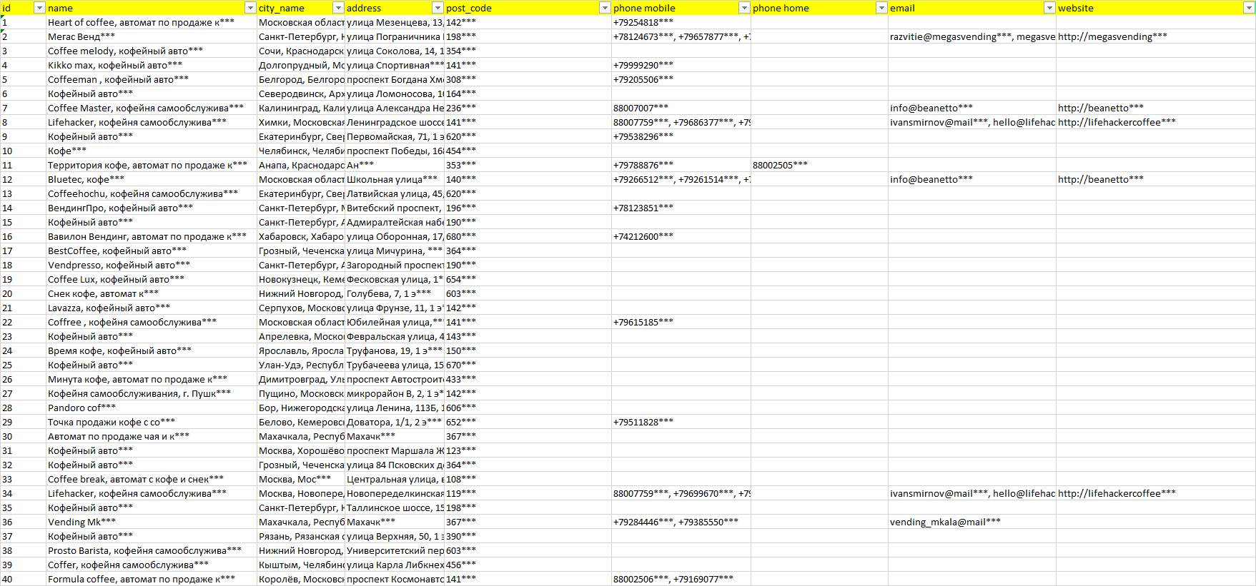 База организаций кофейные автоматы, вся Россия в формате Excel с эл. почтами, телефонами, сайтами, ссылками на соц сети, координатами и другой информацией. Скачайте демо версию, чтобы ознакомиться с данными.