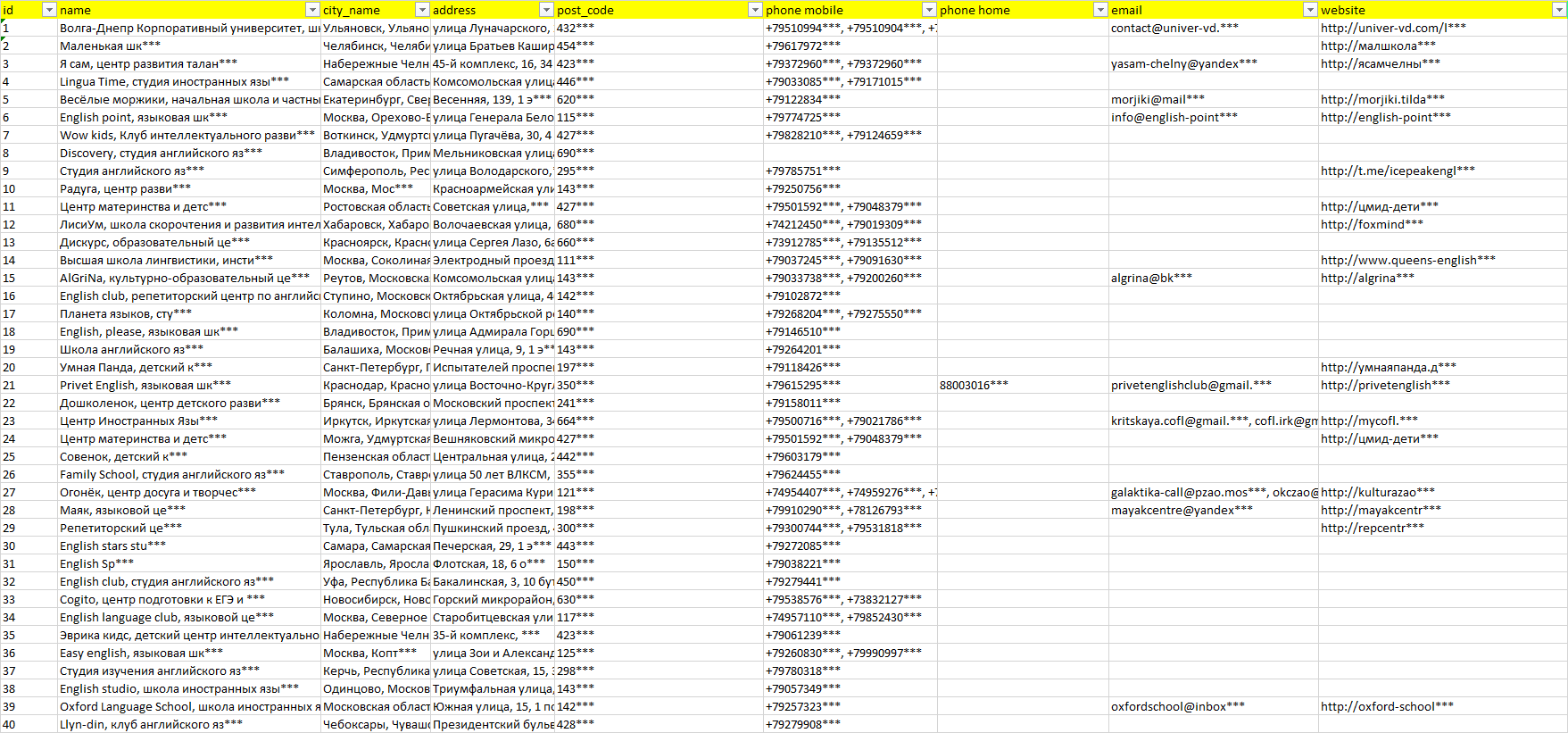 База компаний языковые школы, вся РФ в формате Excel с эл. почтами, телефонами, сайтами, ссылками на соц сети, координатами и другой информацией. Скачайте демо версию, чтобы ознакомиться с данными.