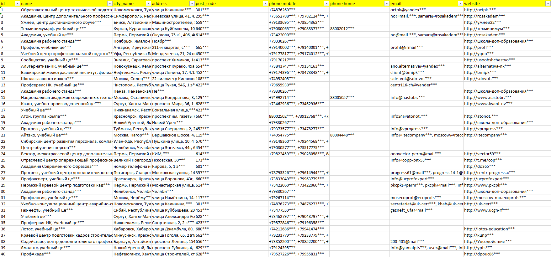 База компаний обучение по промышленной безопасности, вся РФ в формате Excel с эл. почтами, телефонами, сайтами, ссылками на соц сети, координатами и другой информацией. Скачайте демо версию, чтобы ознакомиться с данными.
