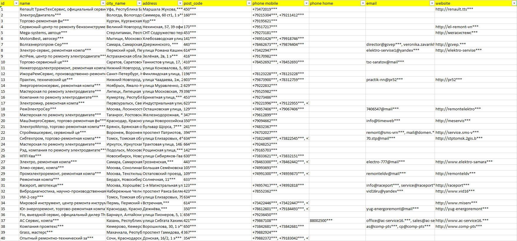 База организаций ремонт электродвигателей, вся Россия в формате Excel с эл. почтами, телефонами, сайтами, ссылками на соц сети, координатами и другой информацией. Скачайте демо версию, чтобы ознакомиться с данными.