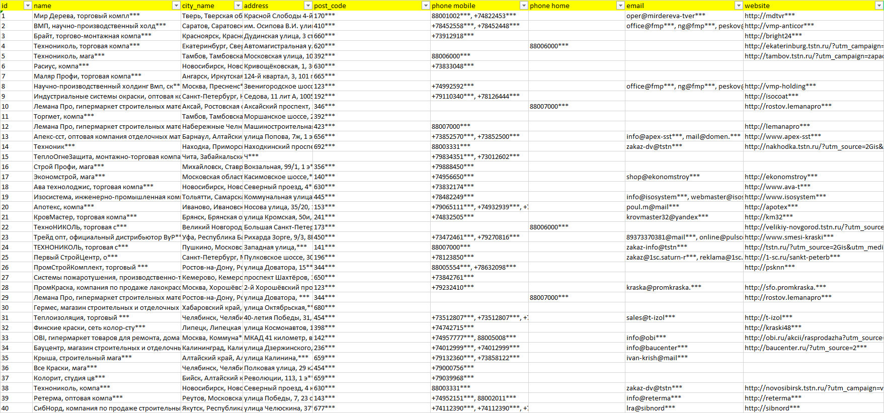 База компаний огнезащитные материалы, вся РФ в формате Excel с эл. почтами, телефонами, сайтами, ссылками на соц сети, координатами и другой информацией. Скачайте демо версию, чтобы ознакомиться с данными.