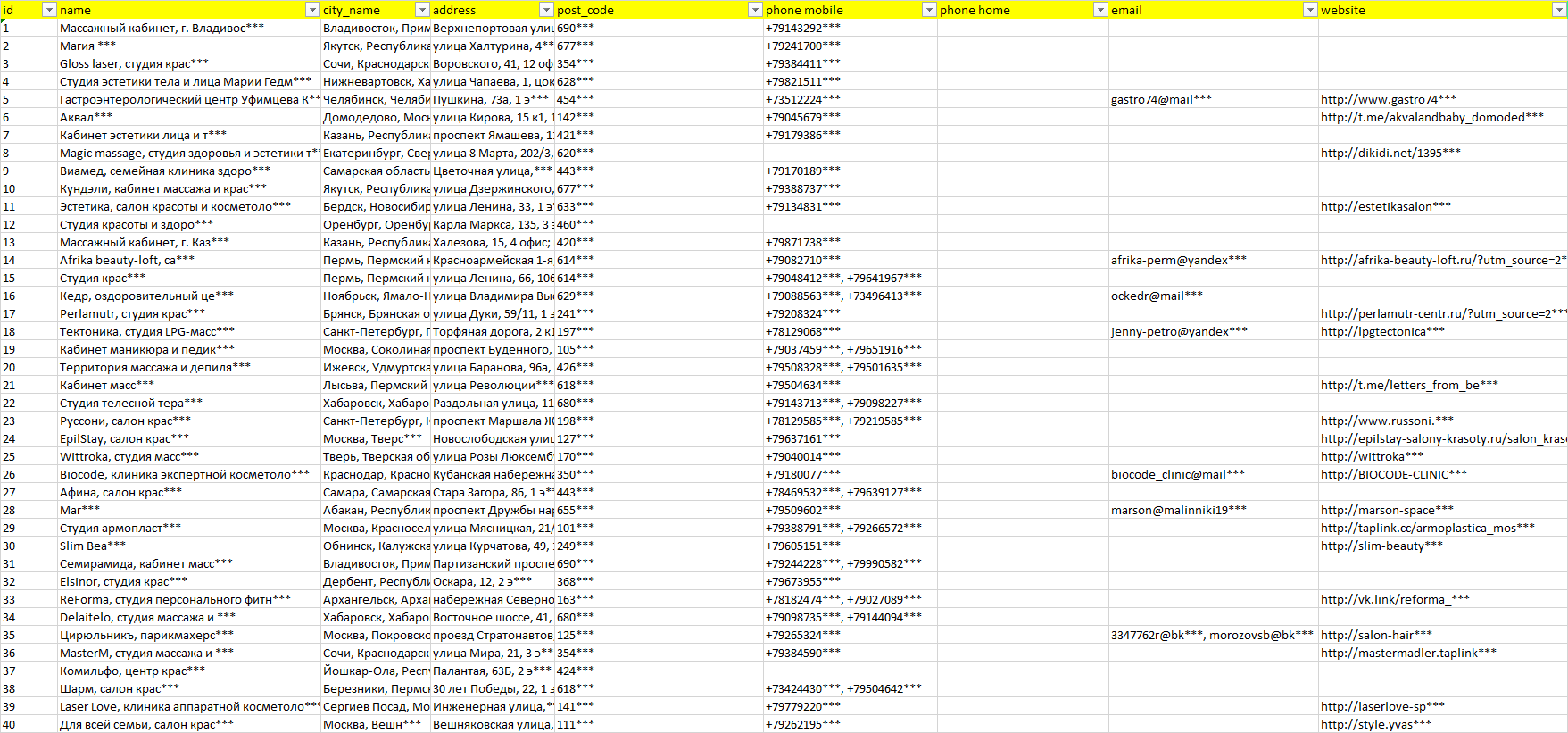 База организаций массажист, вся Россия в формате Excel с эл. почтами, телефонами, сайтами, ссылками на соц сети, координатами и другой информацией. Скачайте демо версию, чтобы ознакомиться с данными.