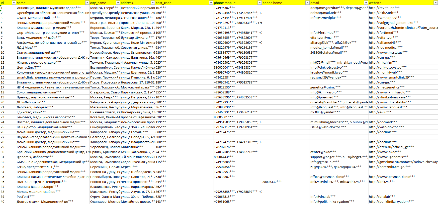 База организаций генетик, вся Россия в формате Excel с эл. почтами, телефонами, сайтами, ссылками на соц сети, координатами и другой информацией. Скачайте демо версию, чтобы ознакомиться с данными.