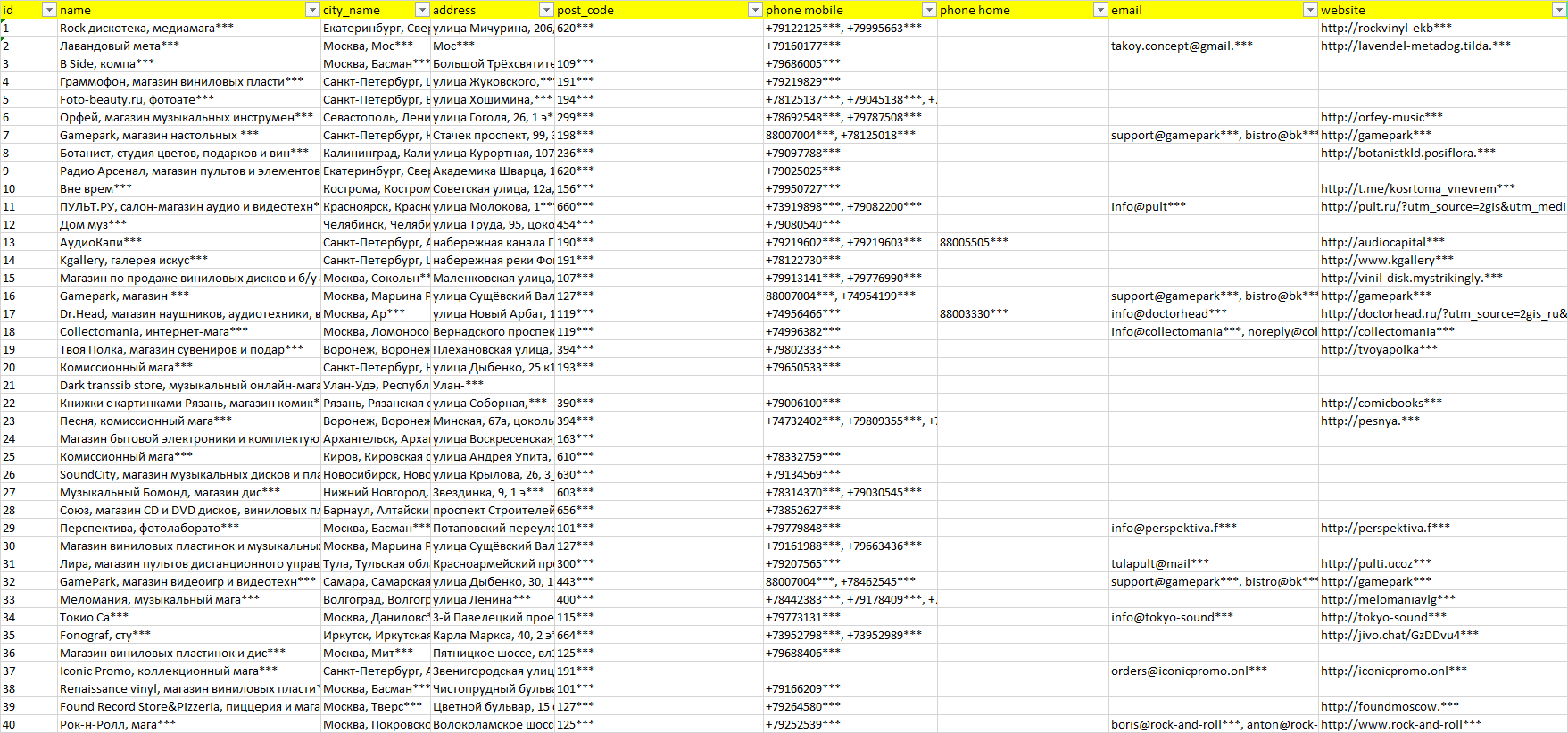 База компаний музыкальные пластинки, вся РФ в формате Excel с эл. почтами, телефонами, сайтами, ссылками на соц сети, координатами и другой информацией. Скачайте демо версию, чтобы ознакомиться с данными.