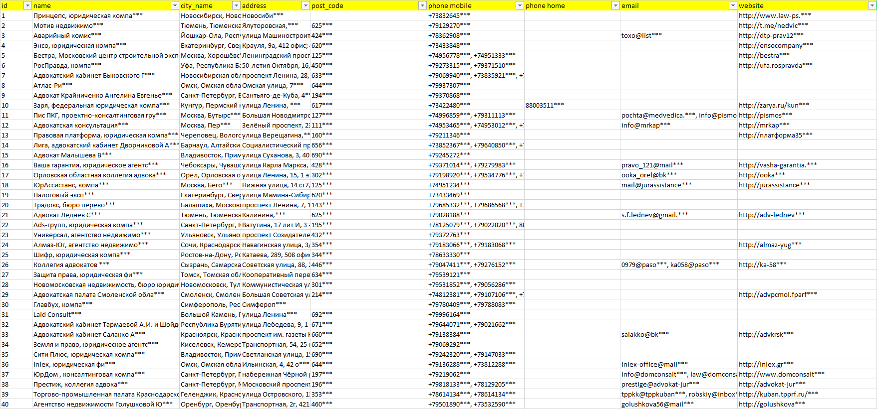 База организаций юридические услуги, вся Россия в формате Excel с эл. почтами, телефонами, сайтами, ссылками на соц сети, координатами и другой информацией. Скачайте демо версию, чтобы ознакомиться с данными.