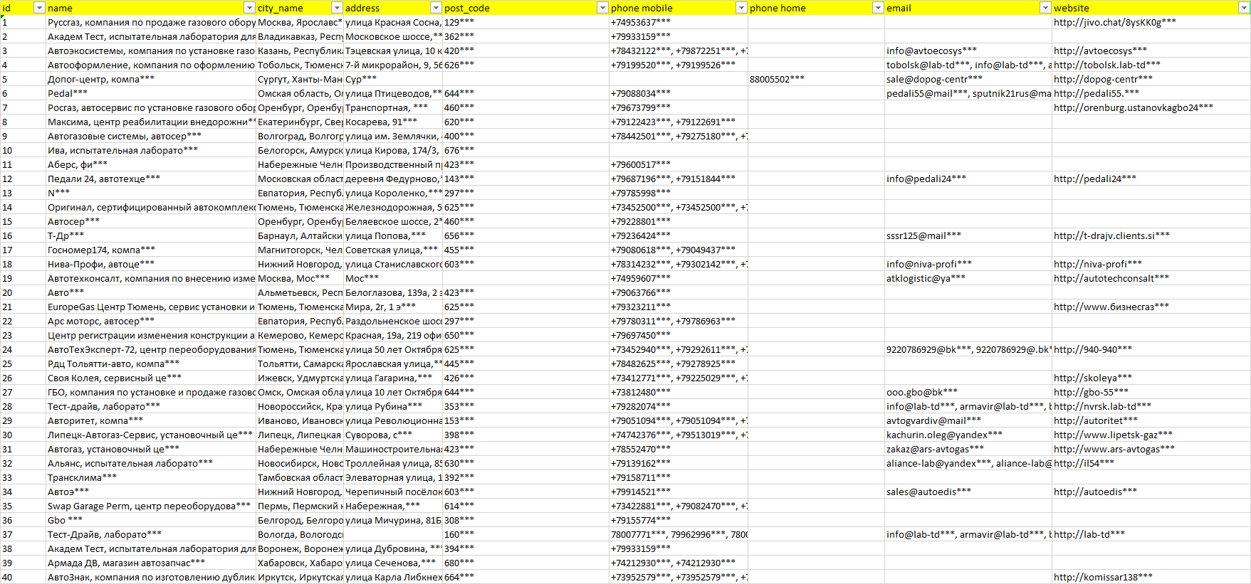 База компаний помощь в регистрации переоборудования авто, вся РФ в формате Excel с эл. почтами, телефонами, сайтами, ссылками на соц сети, координатами и другой информацией. Скачайте демо версию, чтобы ознакомиться с данными.