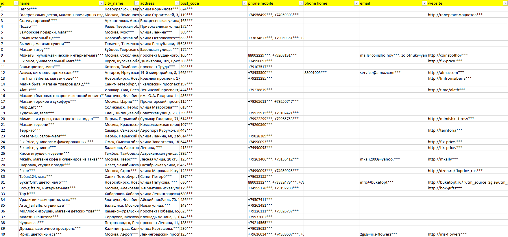 База организаций сувениры, вся Россия в формате Excel с эл. почтами, телефонами, сайтами, ссылками на соц сети, координатами и другой информацией. Скачайте демо версию, чтобы ознакомиться с данными.
