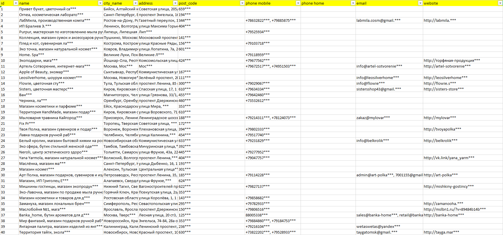 База организаций косметика ручной работы, вся Россия в формате Excel с эл. почтами, телефонами, сайтами, ссылками на соц сети, координатами и другой информацией. Скачайте демо версию, чтобы ознакомиться с данными.