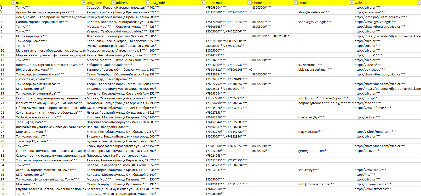 База организаций спутниковая связь, вся Россия в формате Excel с эл. почтами, телефонами, сайтами, ссылками на соц сети, координатами и другой информацией. Скачайте демо версию, чтобы ознакомиться с данными.