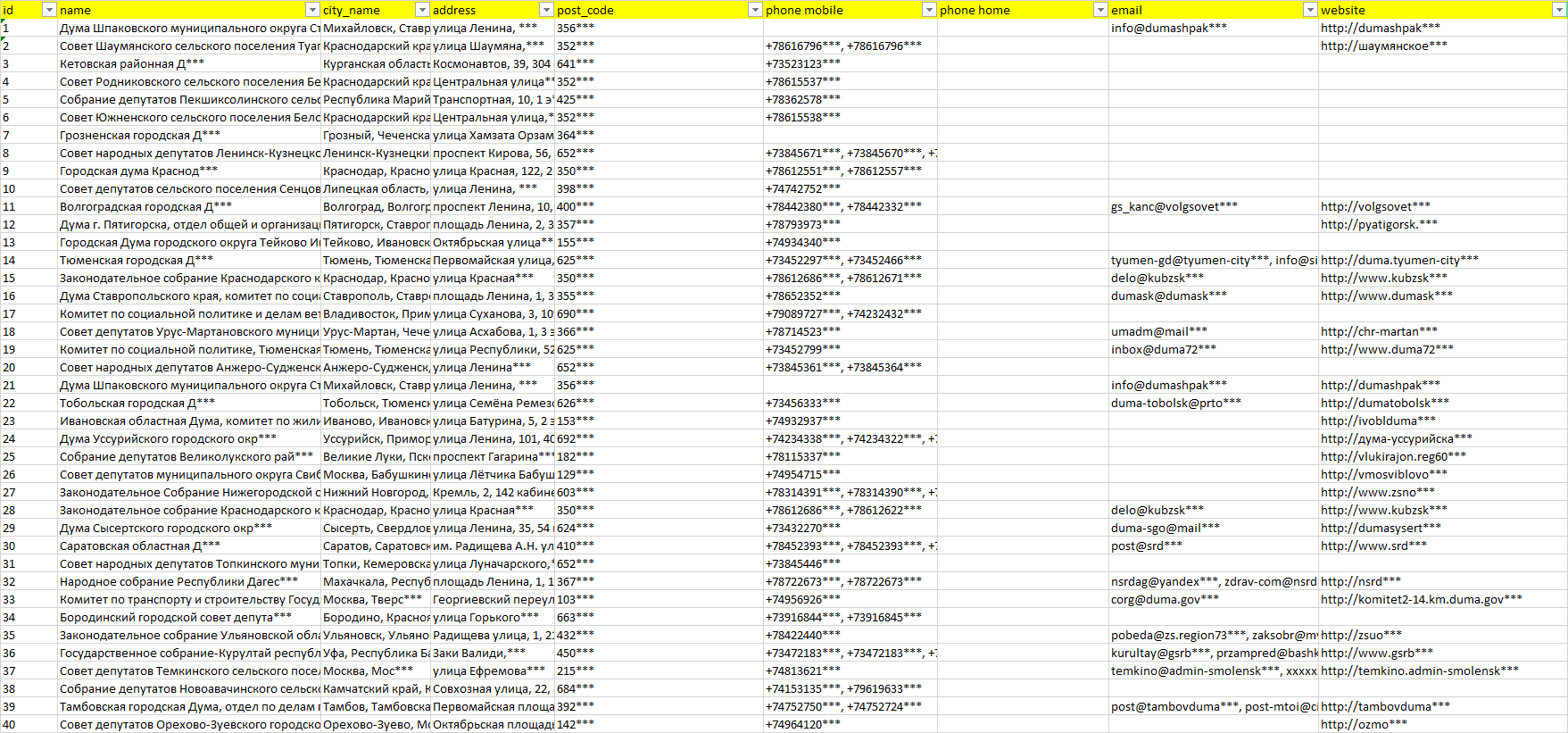 База организаций законодательная власть, вся Россия в формате Excel с эл. почтами, телефонами, сайтами, ссылками на соц сети, координатами и другой информацией. Скачайте демо версию, чтобы ознакомиться с данными.