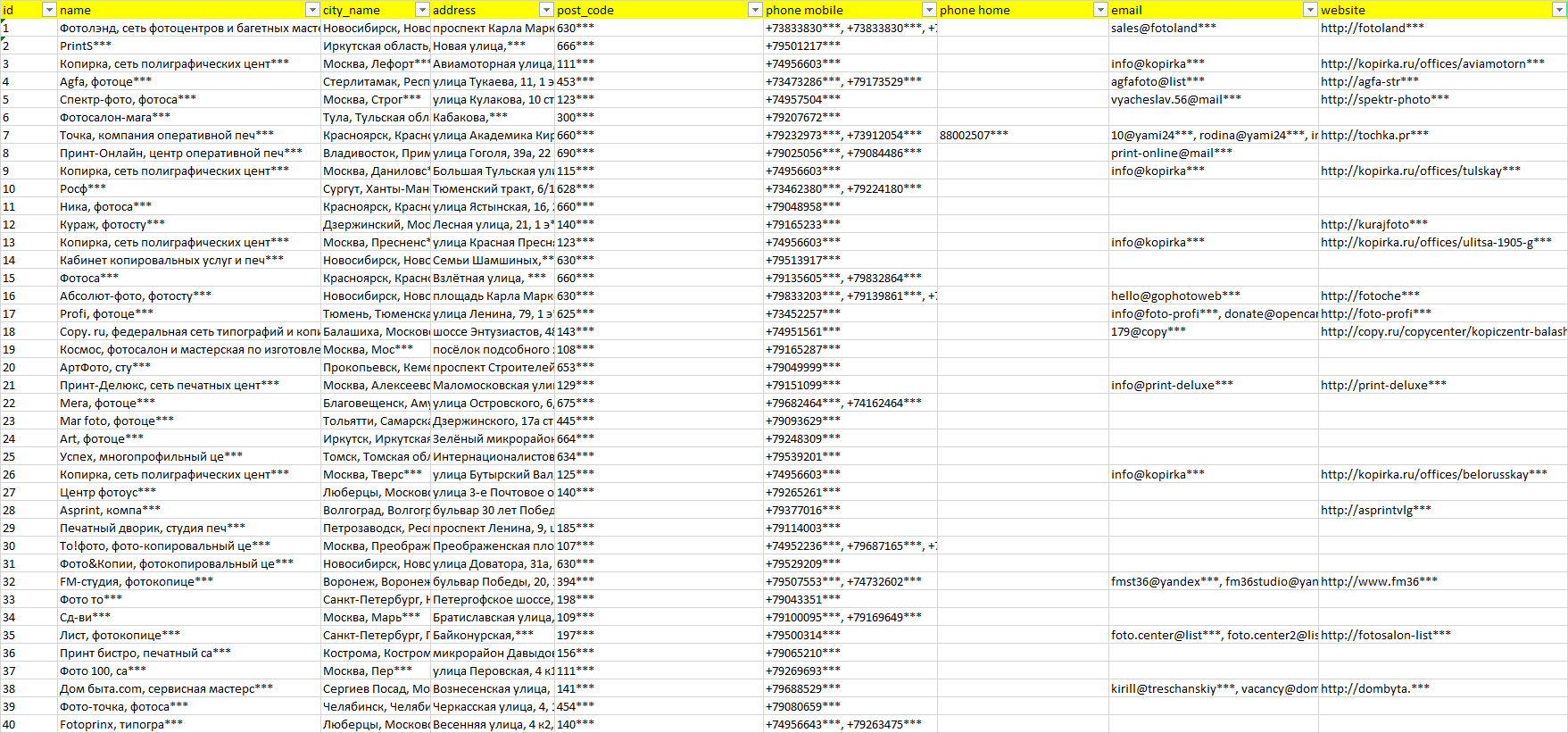 База компаний оцифровка, вся РФ в формате Excel с эл. почтами, телефонами, сайтами, ссылками на соц сети, координатами и другой информацией. Скачайте демо версию, чтобы ознакомиться с данными.