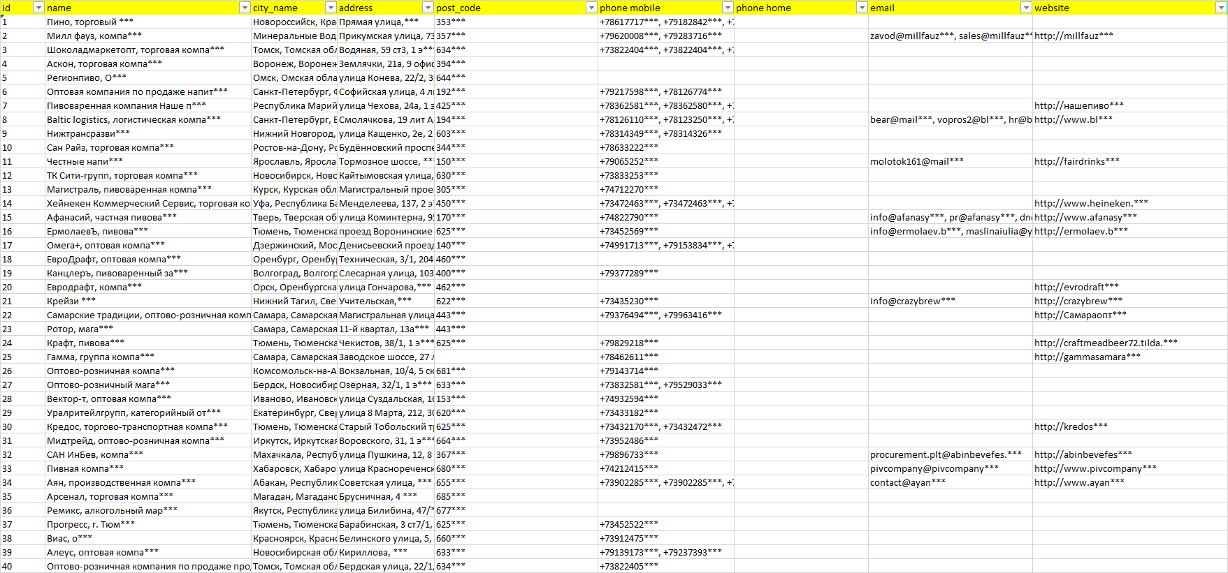 База компаний пиво - опт, вся РФ в формате Excel с эл. почтами, телефонами, сайтами, ссылками на соц сети, координатами и другой информацией. Скачайте демо версию, чтобы ознакомиться с данными.