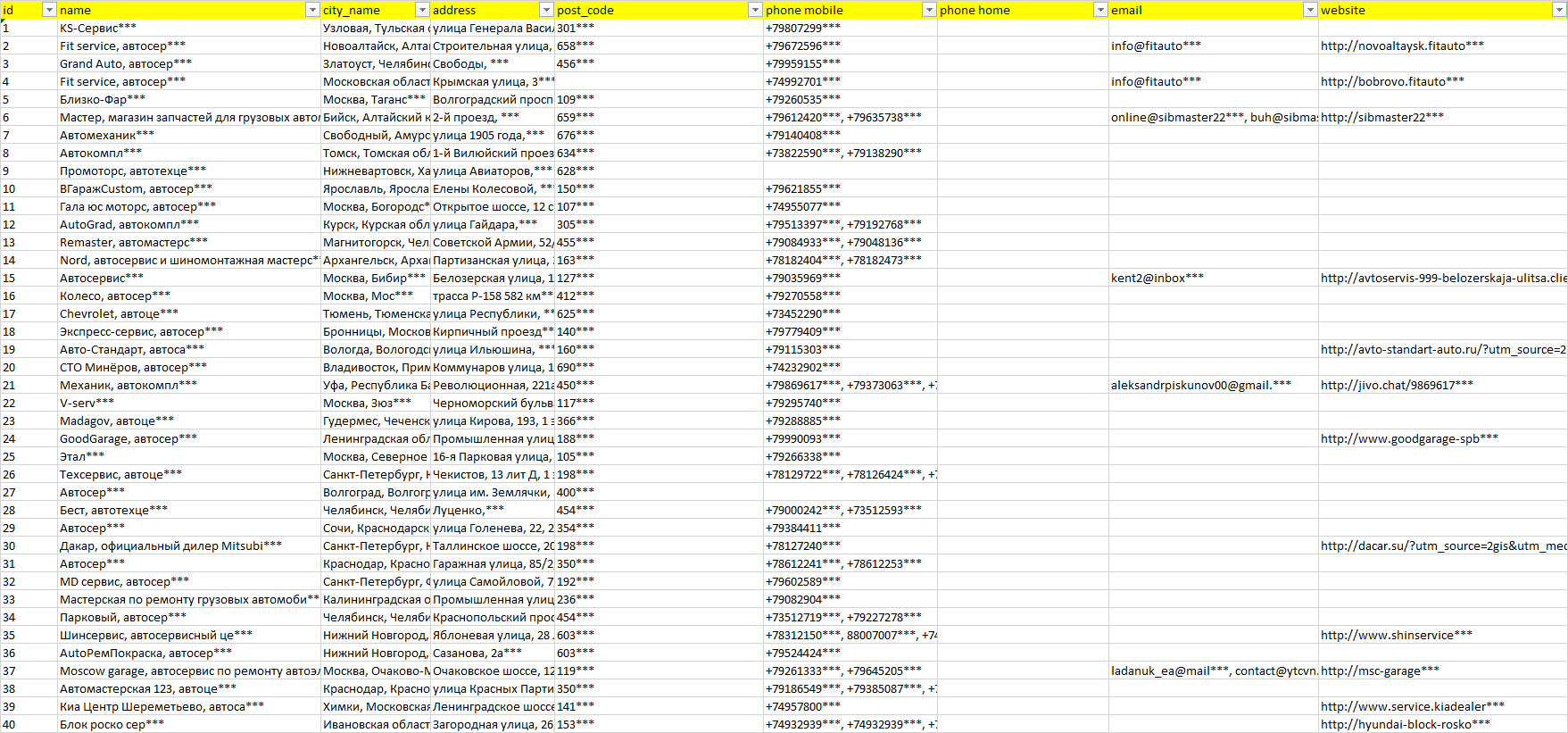 База компаний ремонт мкпп, вся РФ в формате Excel с эл. почтами, телефонами, сайтами, ссылками на соц сети, координатами и другой информацией. Скачайте демо версию, чтобы ознакомиться с данными.