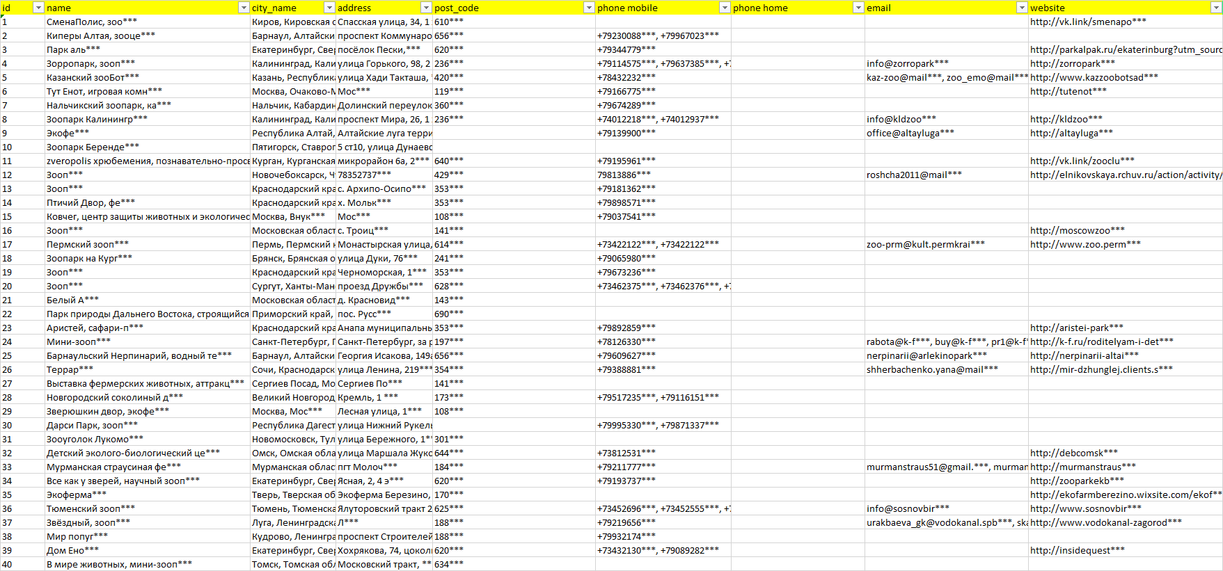База организаций зоопарк, вся Россия в формате Excel с эл. почтами, телефонами, сайтами, ссылками на соц сети, координатами и другой информацией. Скачайте демо версию, чтобы ознакомиться с данными.