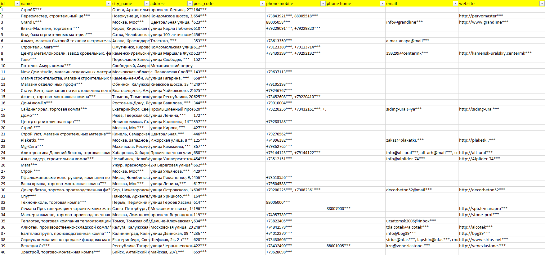База организаций фасадные материалы и конструкции, вся Россия в формате Excel с эл. почтами, телефонами, сайтами, ссылками на соц сети, координатами и другой информацией. Скачайте демо версию, чтобы ознакомиться с данными.