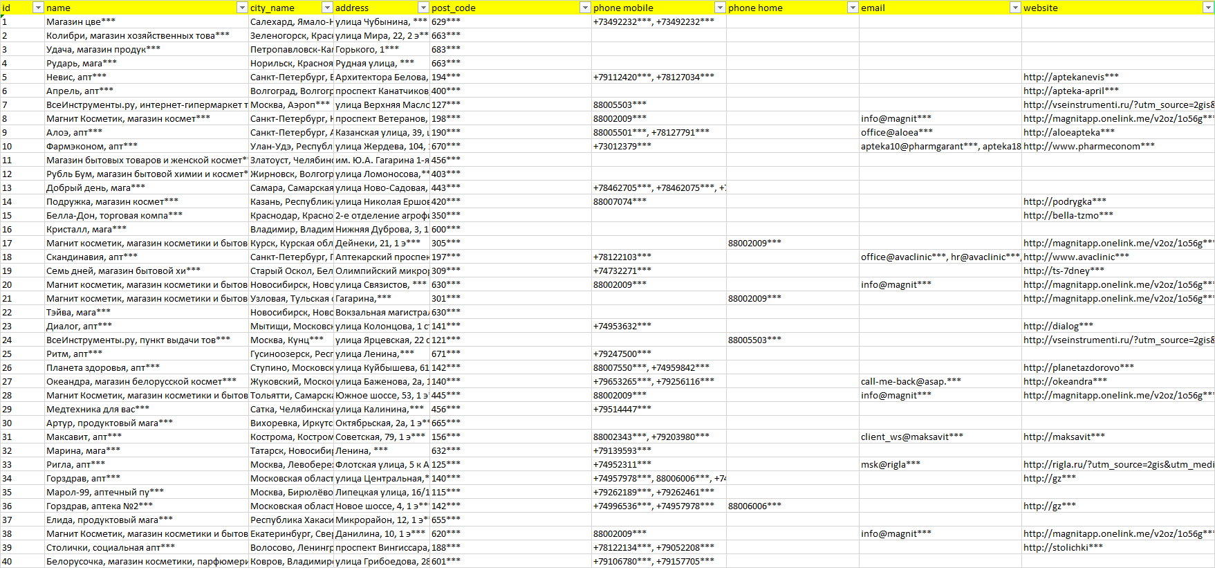 База организаций средства гигиены, вся Россия в формате Excel с эл. почтами, телефонами, сайтами, ссылками на соц сети, координатами и другой информацией. Скачайте демо версию, чтобы ознакомиться с данными.