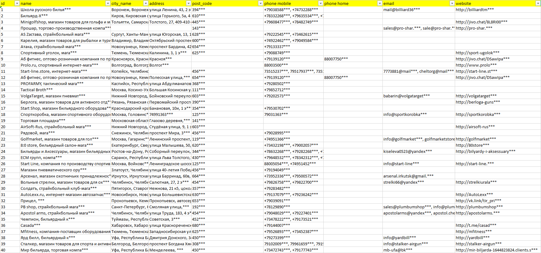 База компаний спортивно-развлекательные товары, вся РФ в формате Excel с эл. почтами, телефонами, сайтами, ссылками на соц сети, координатами и другой информацией. Скачайте демо версию, чтобы ознакомиться с данными.