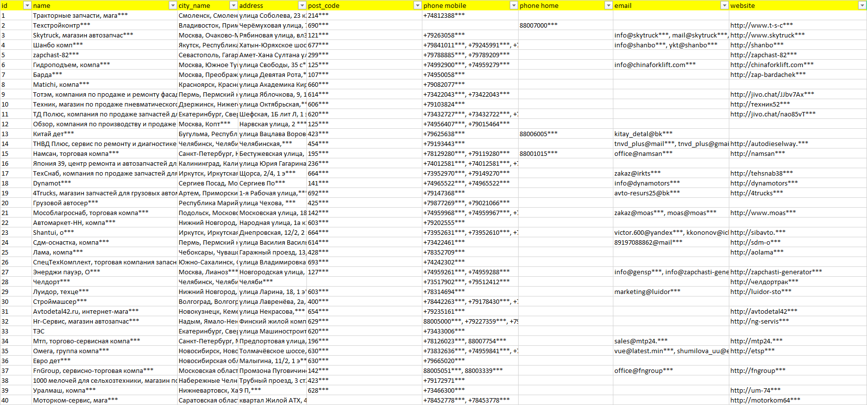 База компаний запчасти для спецтехники, вся РФ в формате Excel с эл. почтами, телефонами, сайтами, ссылками на соц сети, координатами и другой информацией. Скачайте демо версию, чтобы ознакомиться с данными.