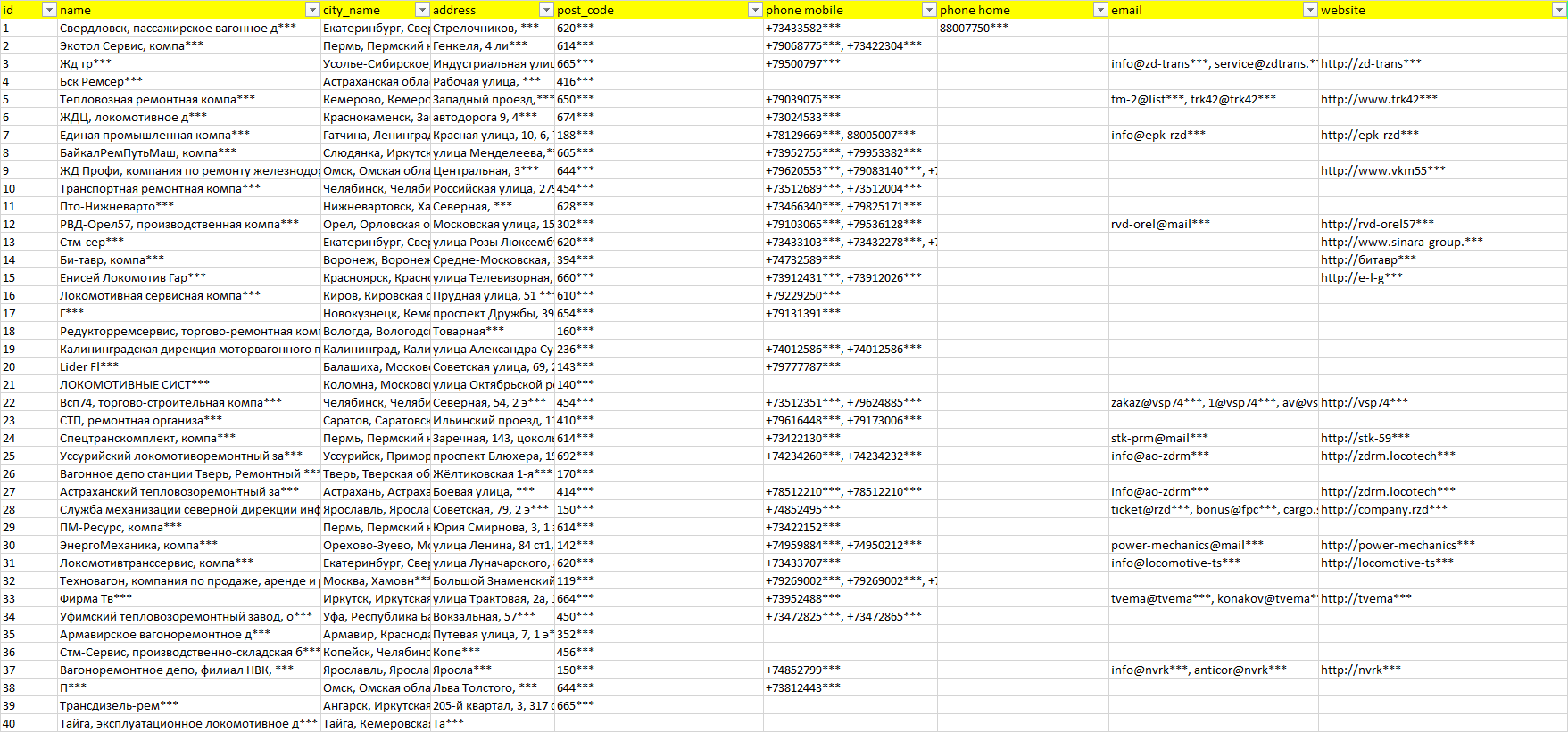 База компаний ремонт железнодорожной техники, вся РФ в формате Excel с эл. почтами, телефонами, сайтами, ссылками на соц сети, координатами и другой информацией. Скачайте демо версию, чтобы ознакомиться с данными.