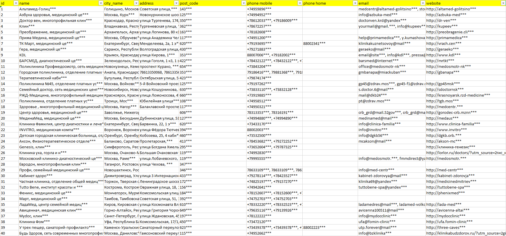 База организаций терапевт, вся Россия в формате Excel с эл. почтами, телефонами, сайтами, ссылками на соц сети, координатами и другой информацией. Скачайте демо версию, чтобы ознакомиться с данными.