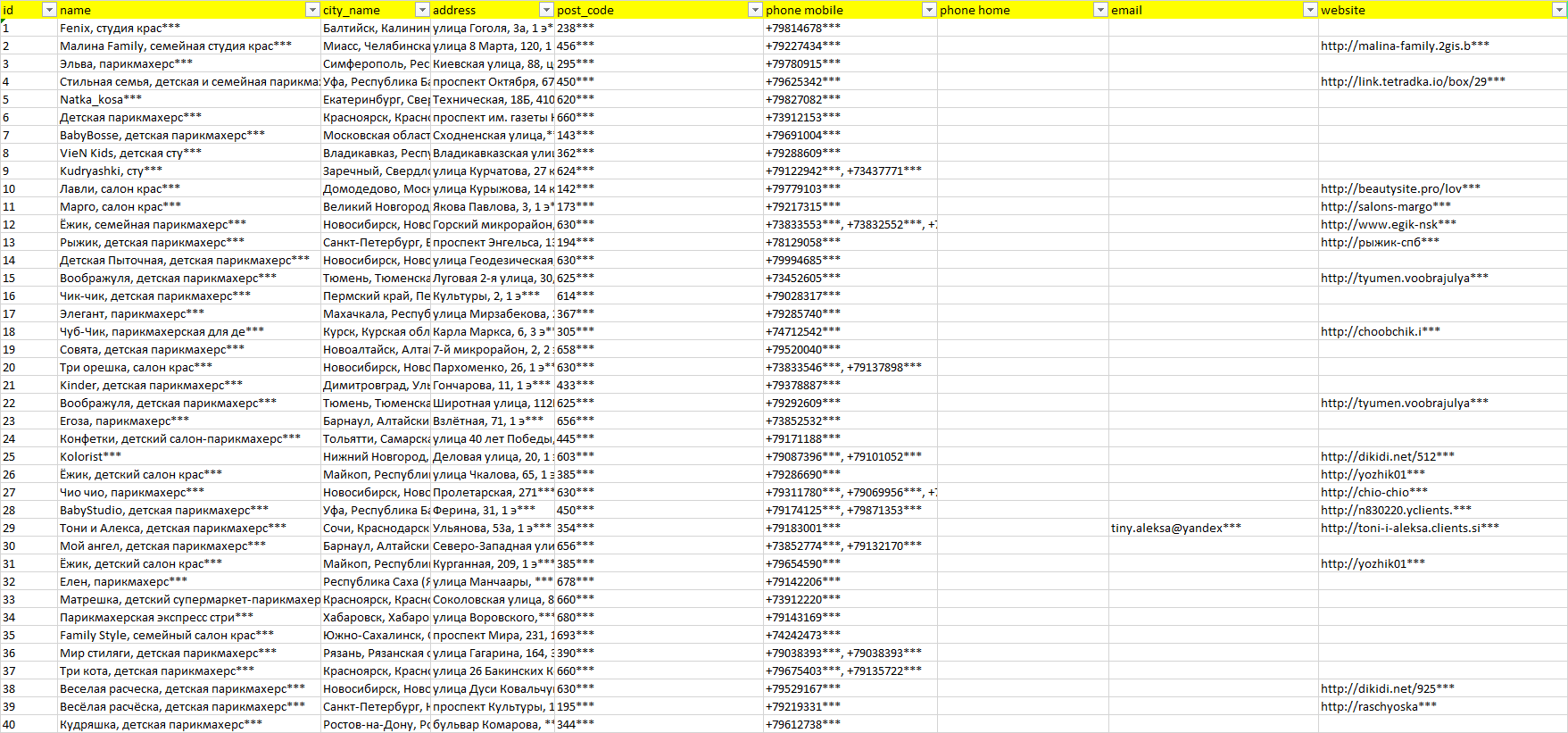 База компаний детские парикмахерские, вся РФ в формате Excel с эл. почтами, телефонами, сайтами, ссылками на соц сети, координатами и другой информацией. Скачайте демо версию, чтобы ознакомиться с данными.
