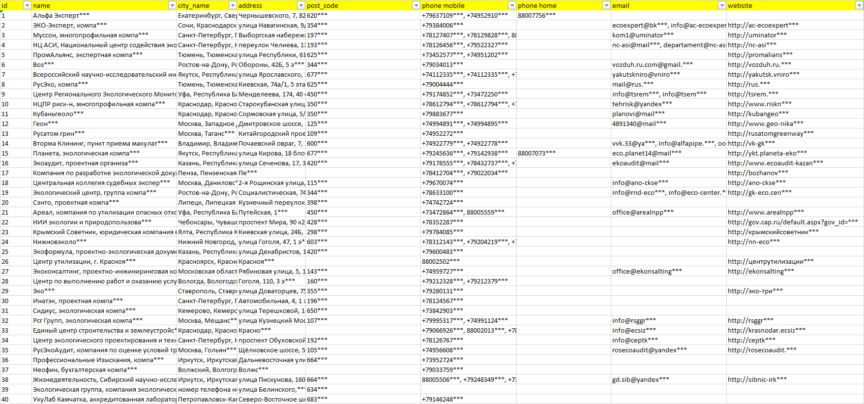 База организаций экологическая оценка, вся Россия в формате Excel с эл. почтами, телефонами, сайтами, ссылками на соц сети, координатами и другой информацией. Скачайте демо версию, чтобы ознакомиться с данными.
