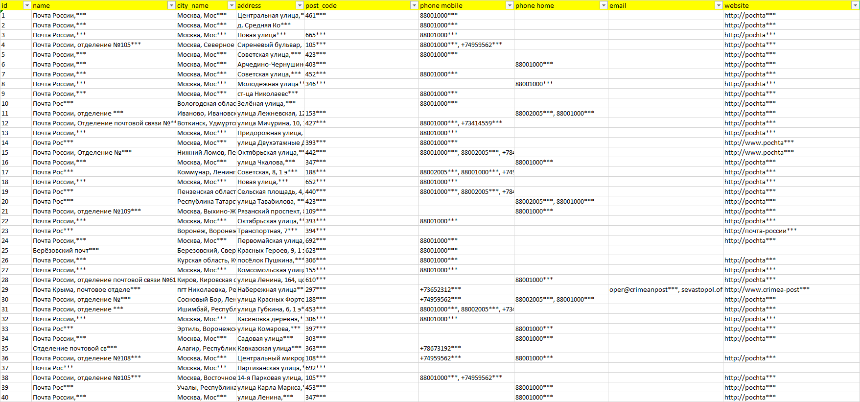 База организаций почта, вся Россия в формате Excel с эл. почтами, телефонами, сайтами, ссылками на соц сети, координатами и другой информацией. Скачайте демо версию, чтобы ознакомиться с данными.