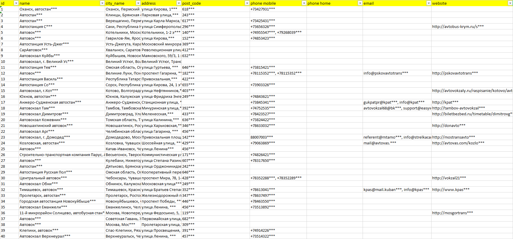 База организаций автовокзалы, вся Россия в формате Excel с эл. почтами, телефонами, сайтами, ссылками на соц сети, координатами и другой информацией. Скачайте демо версию, чтобы ознакомиться с данными.