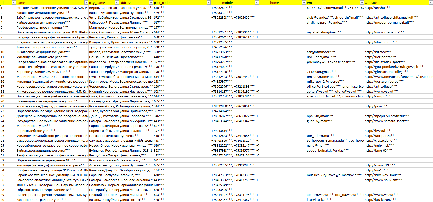 База компаний училища, вся РФ в формате Excel с эл. почтами, телефонами, сайтами, ссылками на соц сети, координатами и другой информацией. Скачайте демо версию, чтобы ознакомиться с данными.