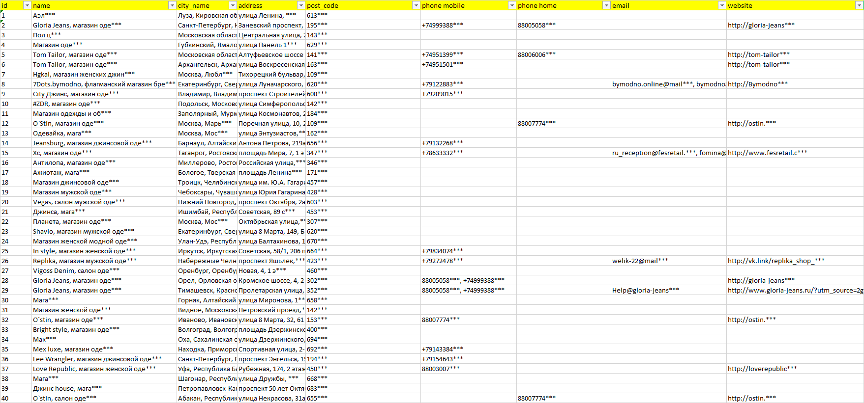 База организаций джинсовая одежда, вся Россия в формате Excel с эл. почтами, телефонами, сайтами, ссылками на соц сети, координатами и другой информацией. Скачайте демо версию, чтобы ознакомиться с данными.