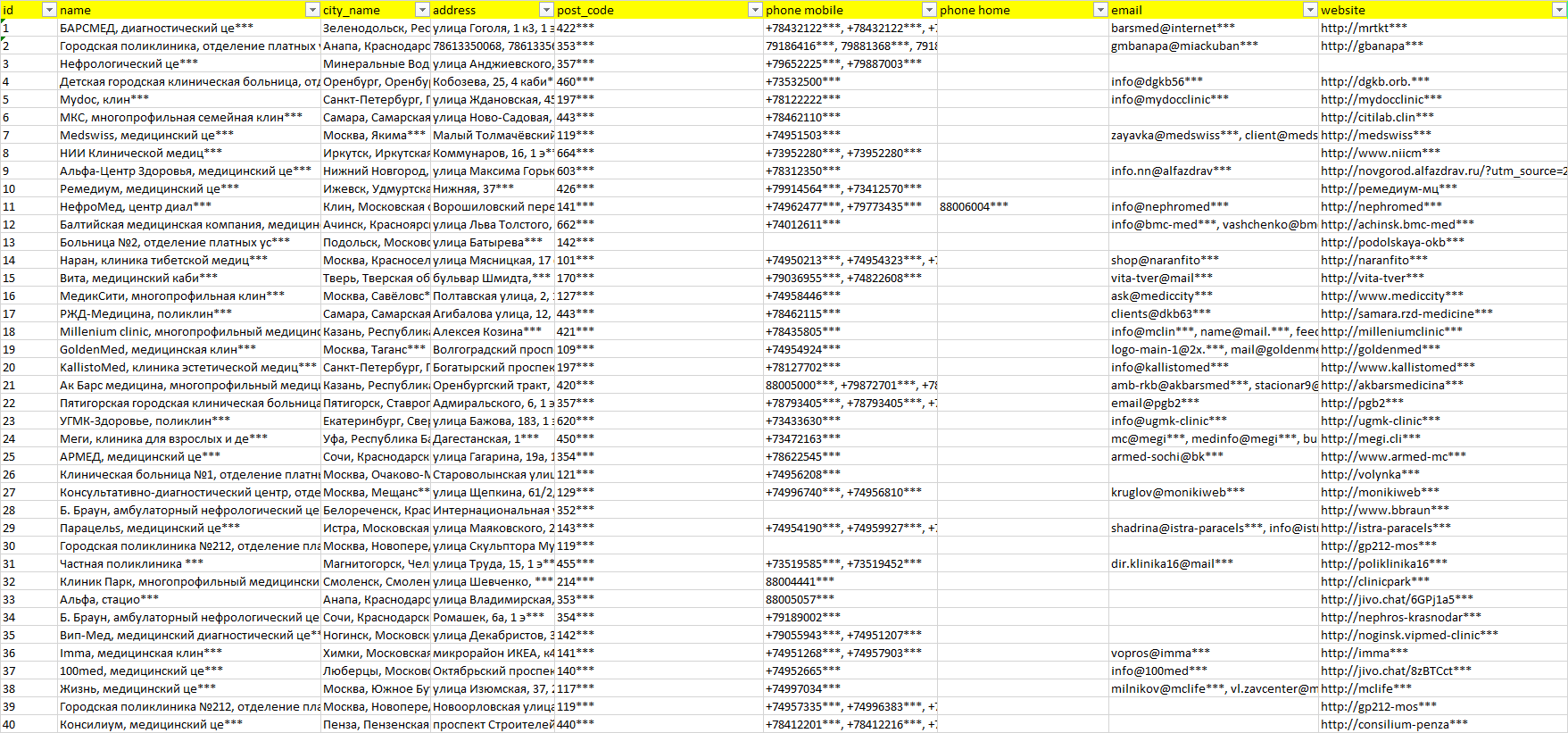 База организаций нефролог, вся Россия в формате Excel с эл. почтами, телефонами, сайтами, ссылками на соц сети, координатами и другой информацией. Скачайте демо версию, чтобы ознакомиться с данными.