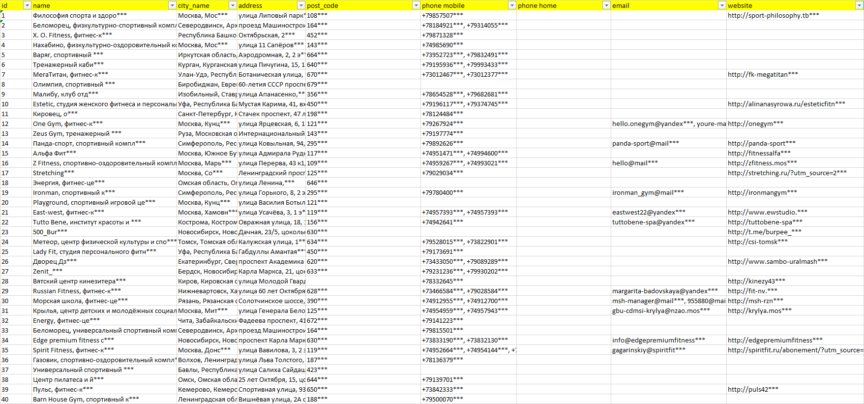База компаний тренажёрные залы, вся РФ в формате Excel с эл. почтами, телефонами, сайтами, ссылками на соц сети, координатами и другой информацией. Скачайте демо версию, чтобы ознакомиться с данными.